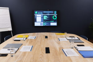 Conference room statistics displayed on monitor prepared for mee
